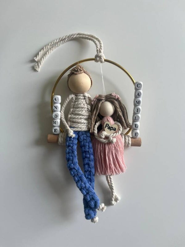 PERSONALISATION : chaque personnage en macramé est fait pour représenter chaque membre de la famille, la couleur et le style de cheveux, la couleur des vêtements et les accessoires (lunettes, accessoires pour les cheveux, petits bouquets de fleurs …